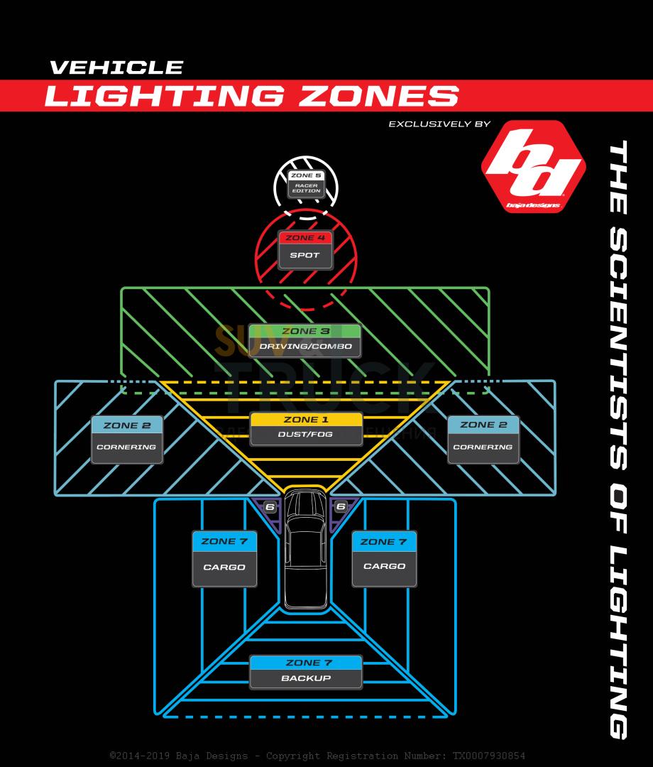 Wide Cornering (широкоугольный): BD первые, кто разработал схему, идеально подходящую для поворотов, вождения в пыли и/или тумане. Модель обеспечивает рассеивание светового луча на 42° для максимального комфорта. (Lighting Zones 1 & 2 - зоны освещения 1 и 2).