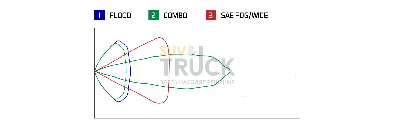Комбинированная схема луча сочетает в себе оптику Driving и Flood (водительский и рабочий). Она даёт сфокусированный прямоугольный свет с углом 65x25 градусов. Комбинированная линза имеет с одной стороны заливающую светом оптику, а с другой – водительский свет.