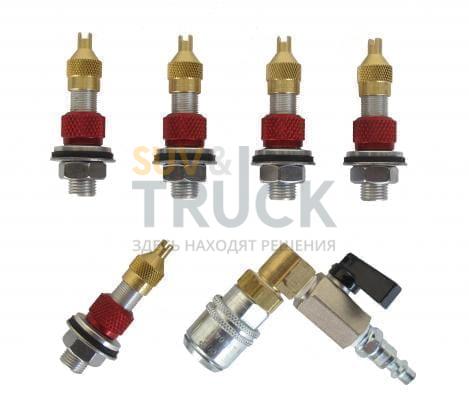 Набор, состоящий из 5-ти монтажных клапанов для накачки колес внедорожников и воздушным патроном с контрагайкой. Клапаны имеют золотник с отверткой для более удобного и быстрого процесса.