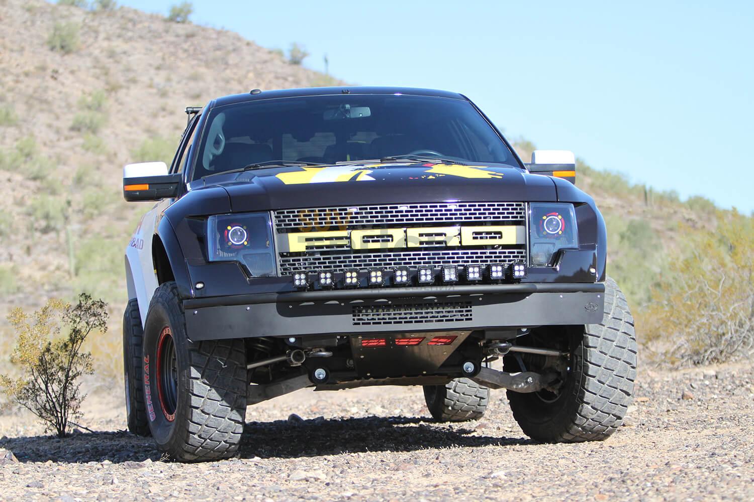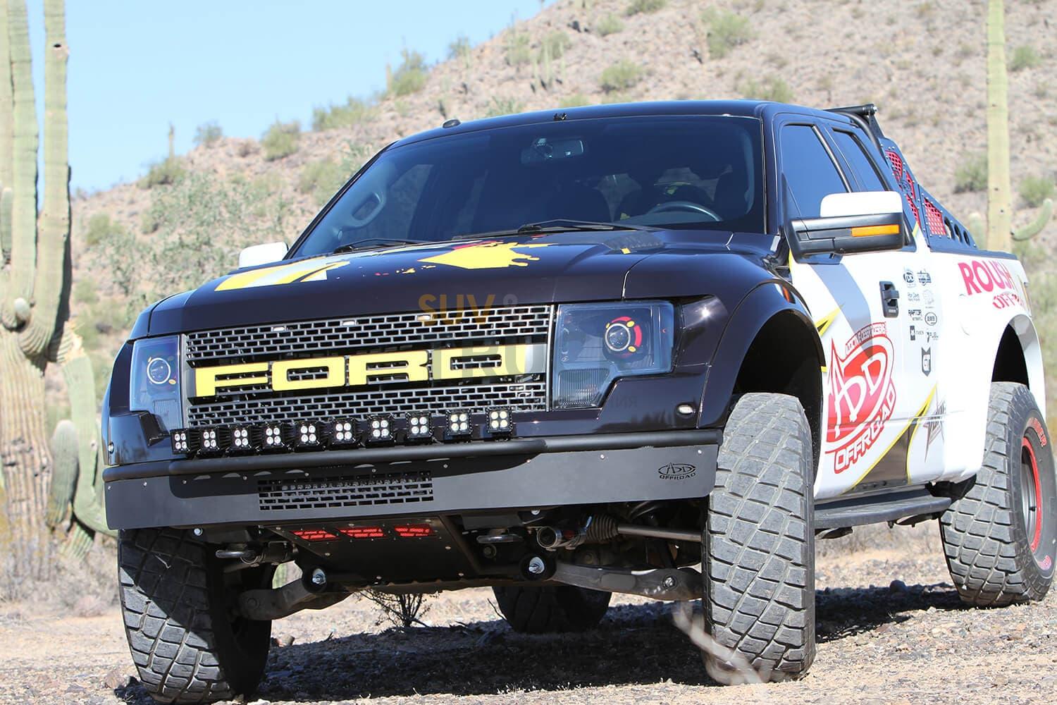 2010 - 2014 Ford Raptor Race Series "R" Front Bumper with ADD Logo and plastic front valance panel with mount for 10 single lights on top and 20" LED mounts in center in Hammer Black with Satin Black Panels