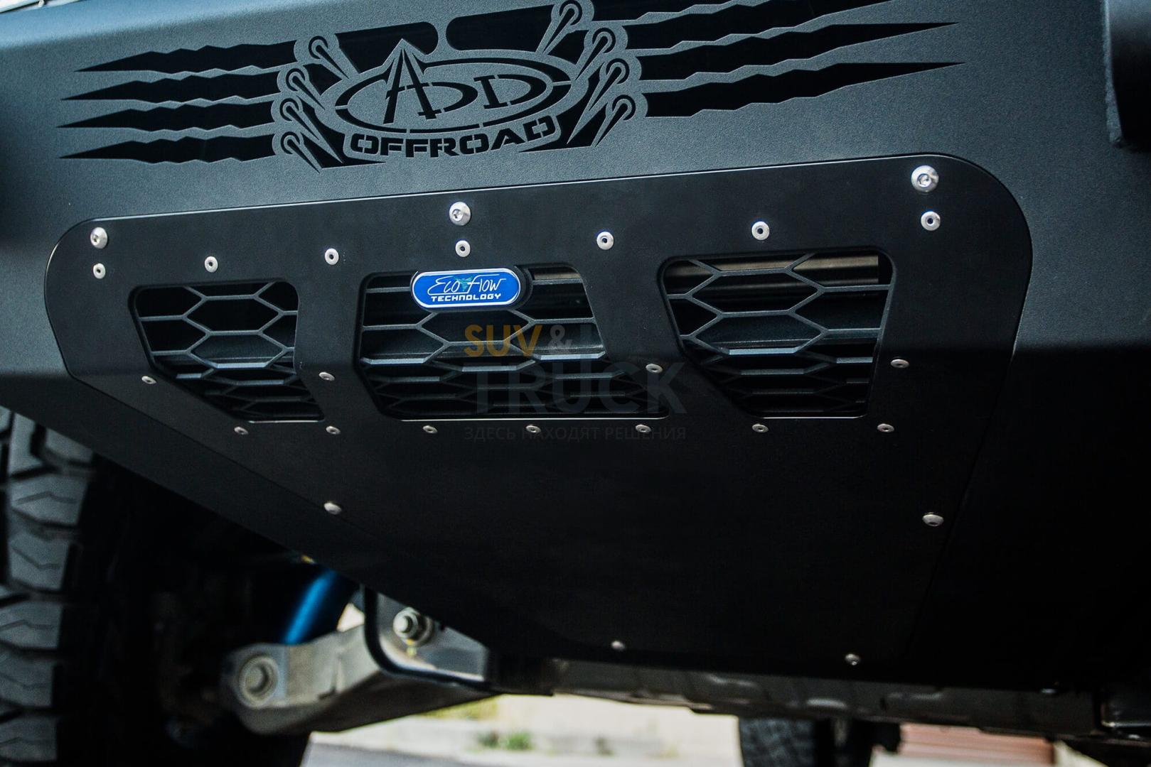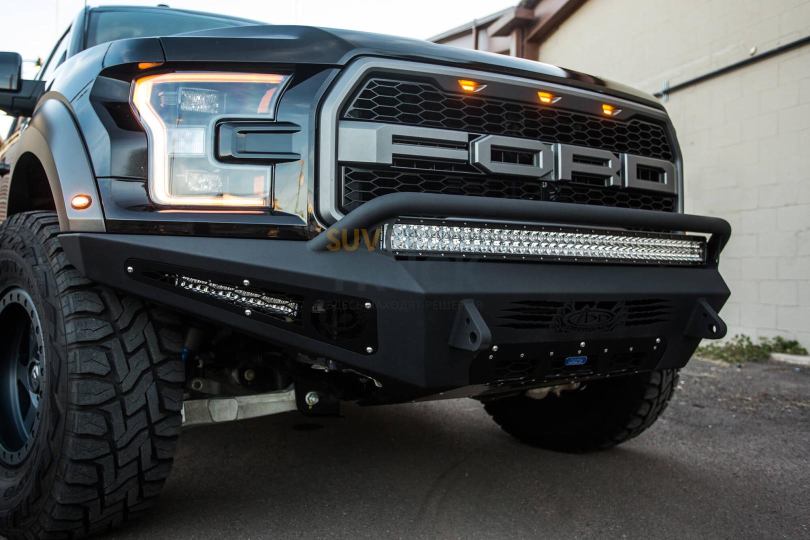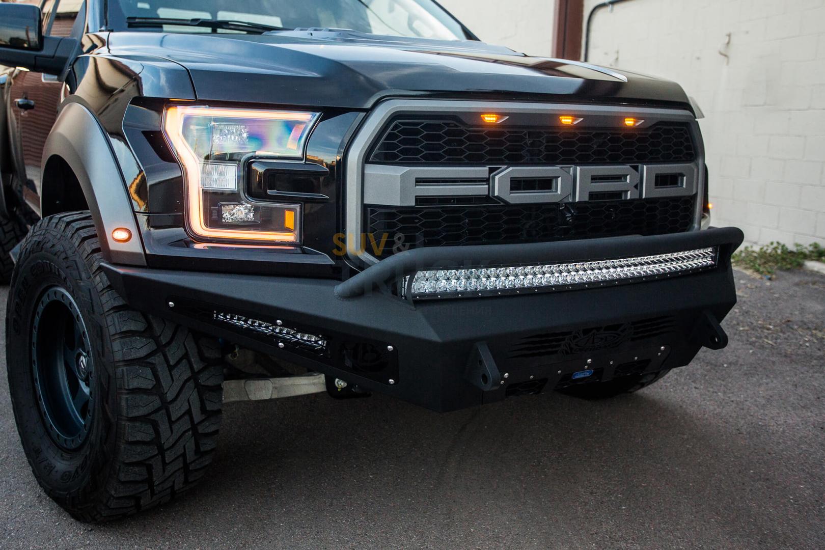 2017 Ford Raptor HoneyBadger Front Bumper with EcoBoost Venting and 40" RDS LED bar mounts with HB logo cutout with 10" LED bar mounts and Dually mounts in sides panels in Hammer Black with Satin Black panels